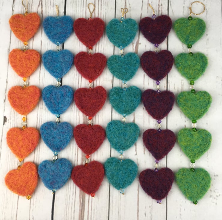 Five pretty hearts needle felted in a blend of orange corriedale wool have been strung together interspersed with acrylic and glass crackle beads. Each heart measures approximately 6cm and the total length of the garland is approximately 34cm including the hanging loop.