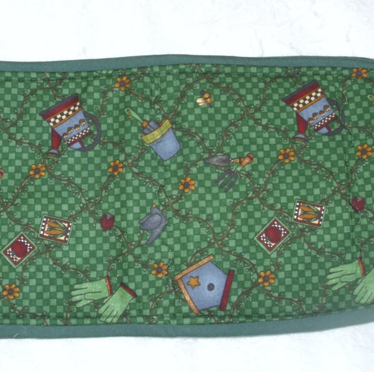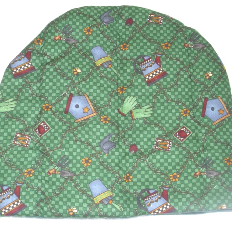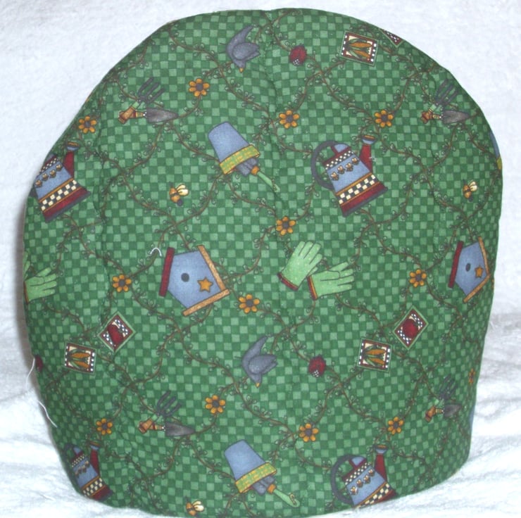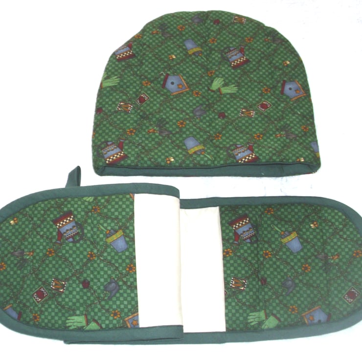 Gardening Tea cosy and ovengloves with gardening gloves, watering cans, buzzy bees, blackbirds, bird houses, bright yellow flowers and seed packets on a dark green check background. tea cosy will keep tea hot for up to half an hour after you make it , tea cosy measures 28.5 cms wide x 25.5 cms high. oven gloves are lined with heatproof material and are ideal to use with oven or microwave cooking, fully washable .