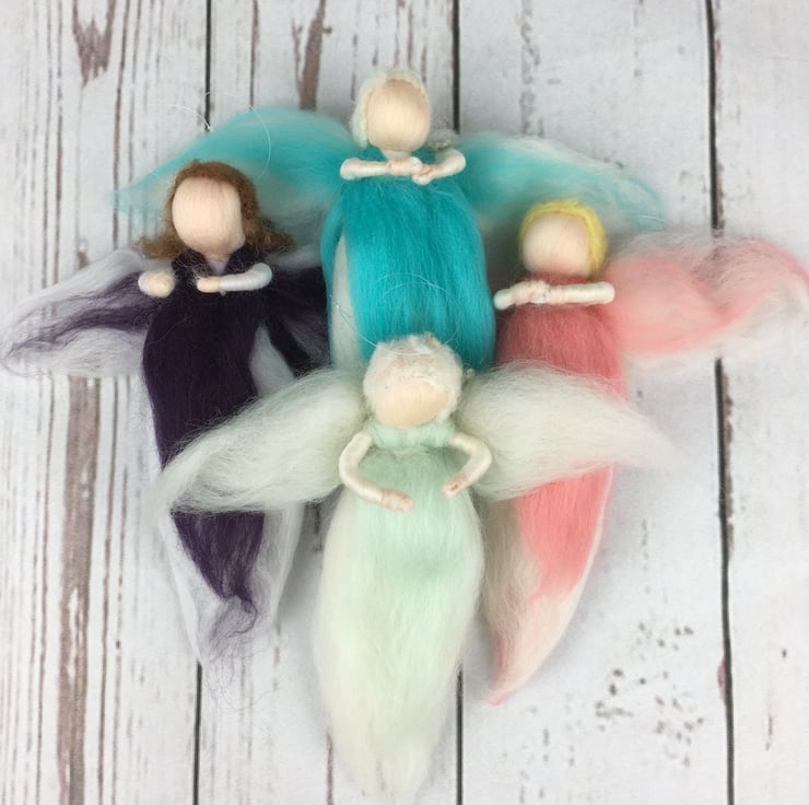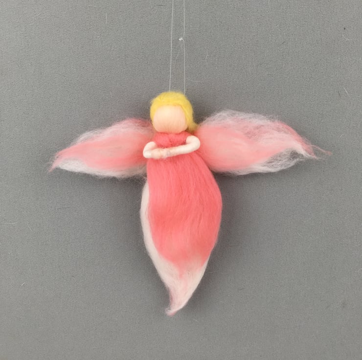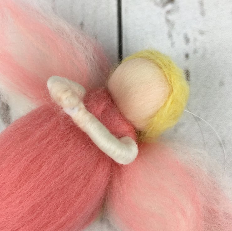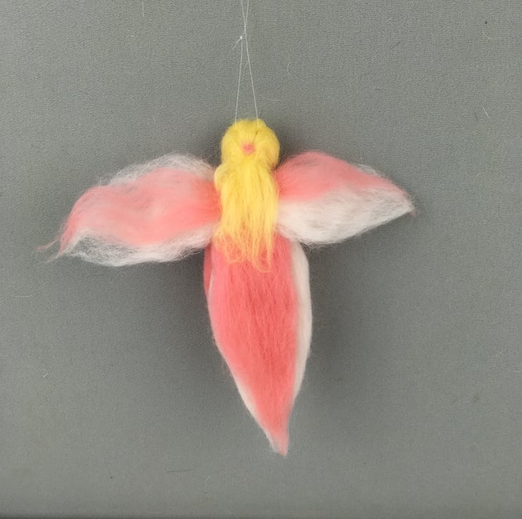 This super angel or fairy has been made using soft merino wool fibres in white and salmon pink. Partially needle felted with loose fibres forming the skirt and wings. The fairy has golden yellow fibres added for the hair, posable arms and a nylon thread hanging loop attached to the back of the head.