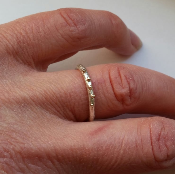 This process has created a beautiful rustic irregular ring which is the only one exactly like it. Lovely 9 ct solid gold balls have been added which make a subtle understated contrast. This dainty ring is lightweight and easy to wear with an average shank width of 1.5/2 mm.