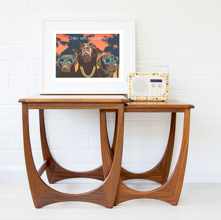 The perfect Chocolate Lab gift for him and/or anyone with an addiction to gangster shows/movies on TV. This Labrador Retriever art print is sure to add a touch of tropical gangster to your walls and would make a fabulous gift for chocolate Labrador lovers, Labrador owners and lovers of all things dog. This Chocolate Labrador art print would make a fun gift idea for boyfriends or anyone who might like some Labrador gangster dog art.