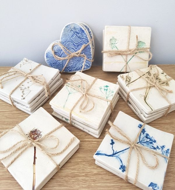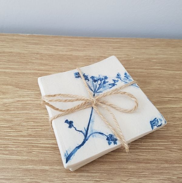 The handmade process of each coaster involves cutting to size, smoothing the edges, decorating, glazing and firing. The set of 4 coasters come presented and tied in raffia string.