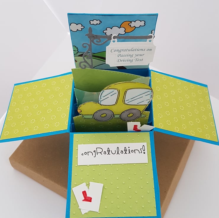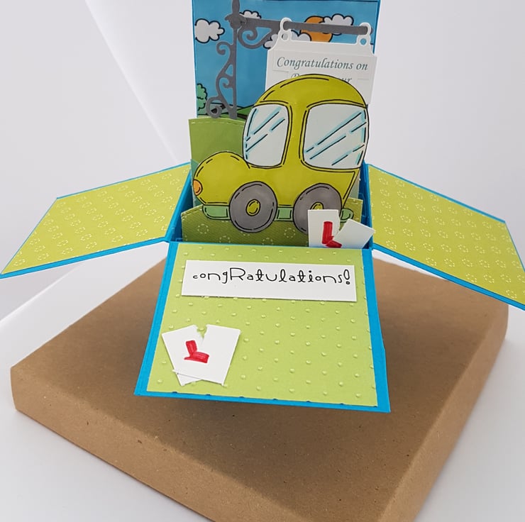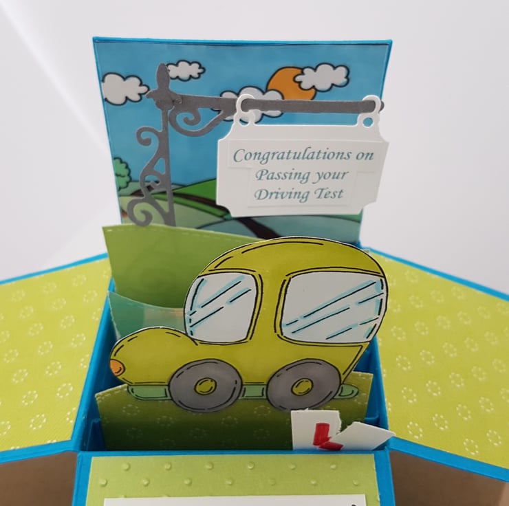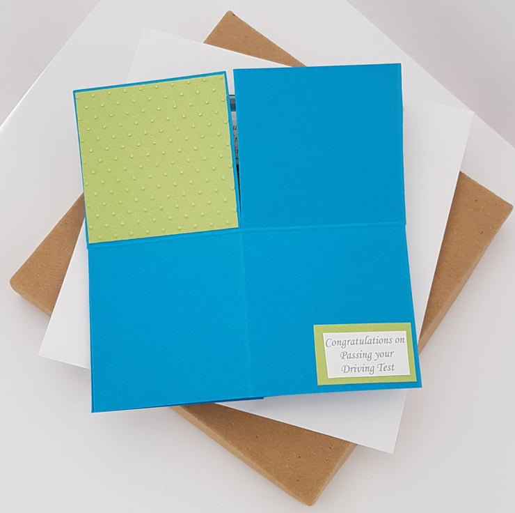 This is a fabulous Congratulations card to celebrate that special someone on passing their driving test. The deep blue base is topped with lime green dotty embossed card and lime green paper. There's a hand coloured back ground, green hills and a lime green hand coloured car. The sentiment reads Congratulations and Congratulations on passing your Driving Test. The card is finished with ripped L plates.
