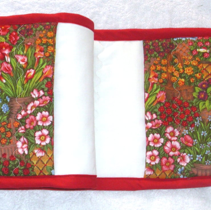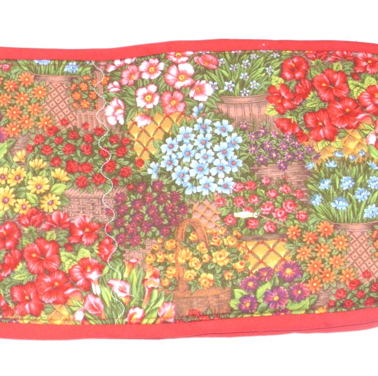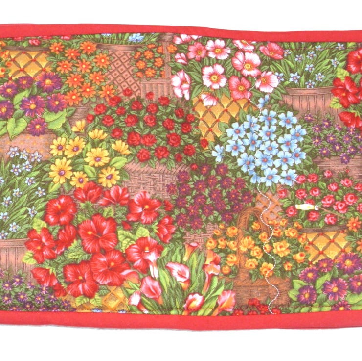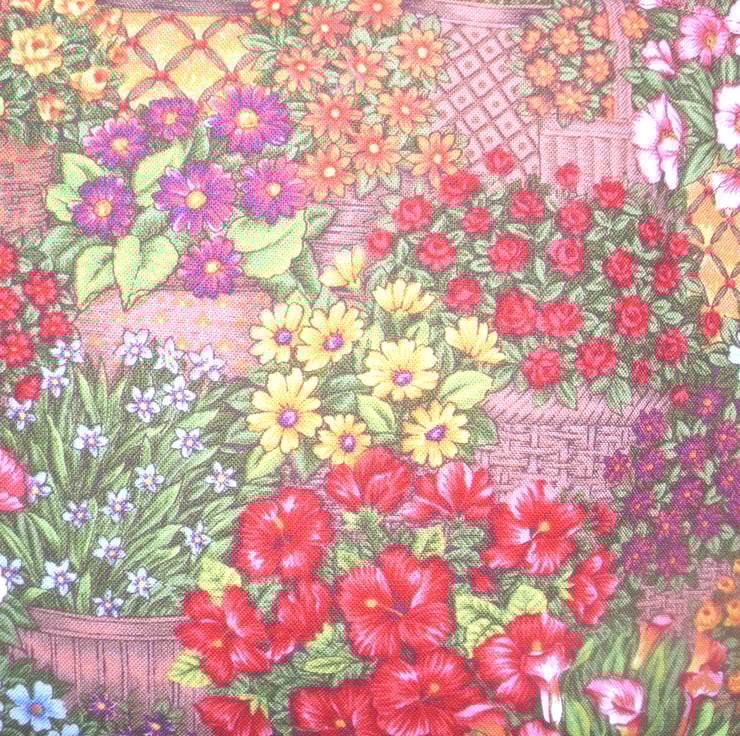 Flower GardenOven Gloves with all kinds of bright flowers in baskets and tubs including tulips, geraniums, roses and many more