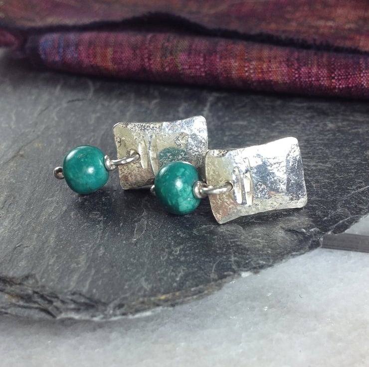 Textured and patterned with hammers and punches , these small rectangles have a handcut turquoise bead dangle and a stud and butterfly fitting.