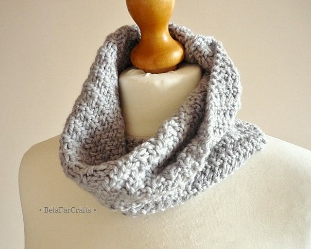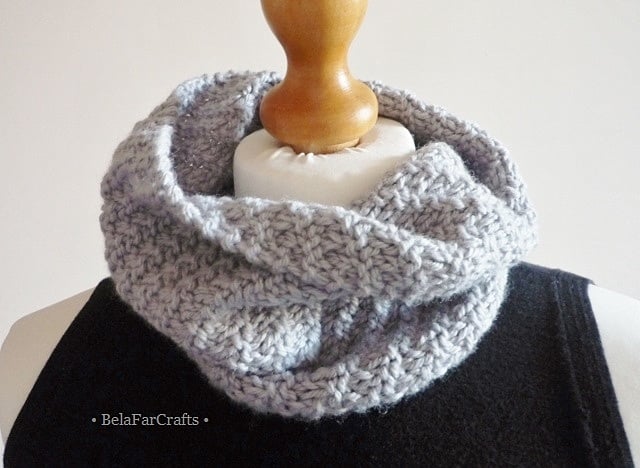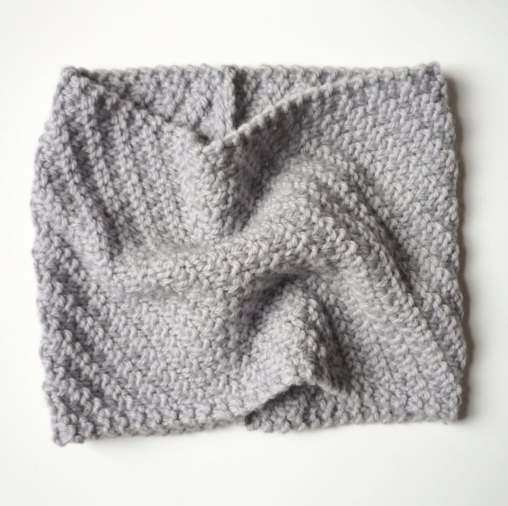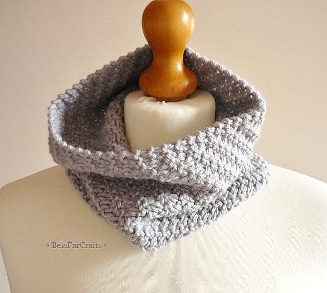 I hand knitted this cowl using wool that is shorn from British sheep and dyed in light grey colour. It is soft to the touch, breathable and comfortable to wear. I used a detailed pattern that adds some texture.