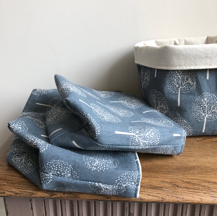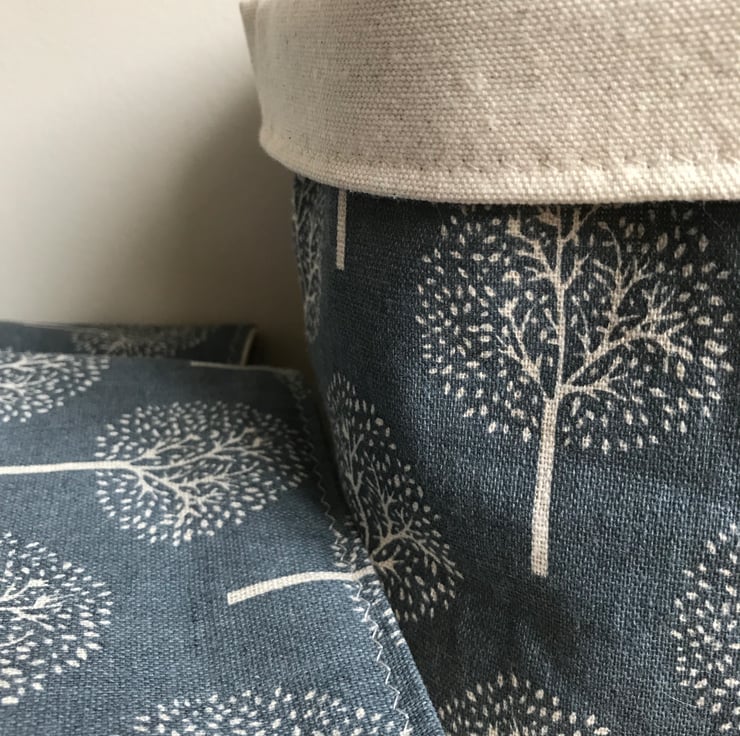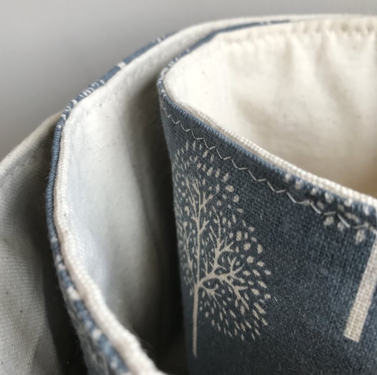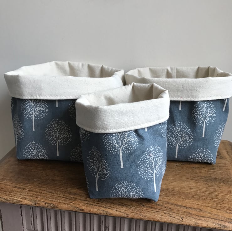 3 sizes of fabric storage basket in a lovely linen/cotton mix printed with silhouette trees on a dark grey background. Each one is lined in cream cotton and a layer of interfacing means they keep their shape.