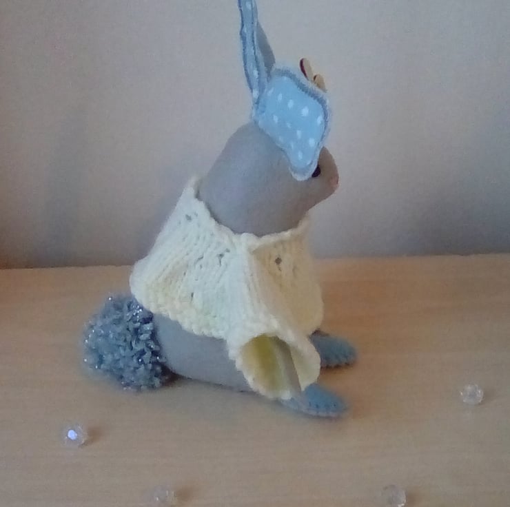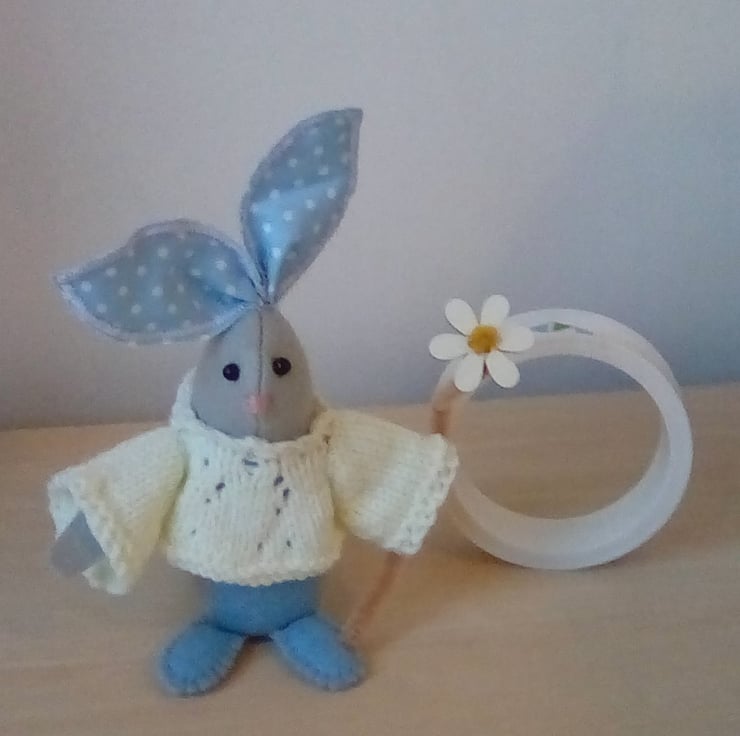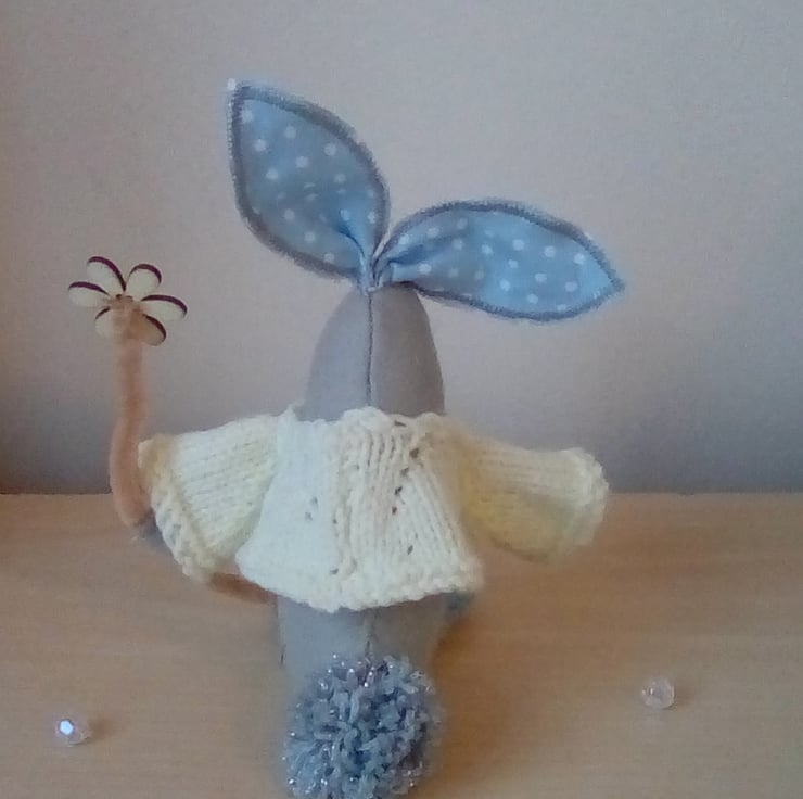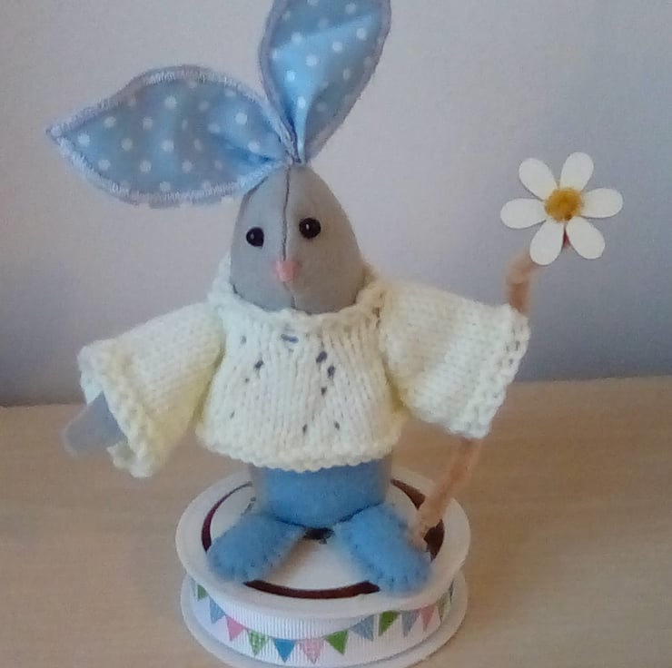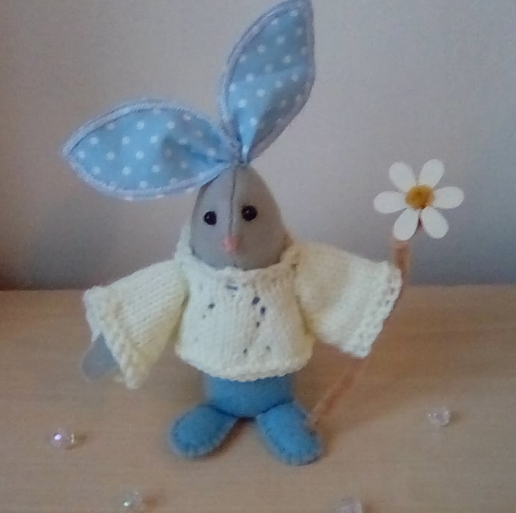 This cute White Rabbit is made of CE marked wool felt and has a cotton knitted jumper. His flower is made of wood and I have used a pipe cleaner for the stalk. He is 5.5 inches tall and has a pom pom tail.