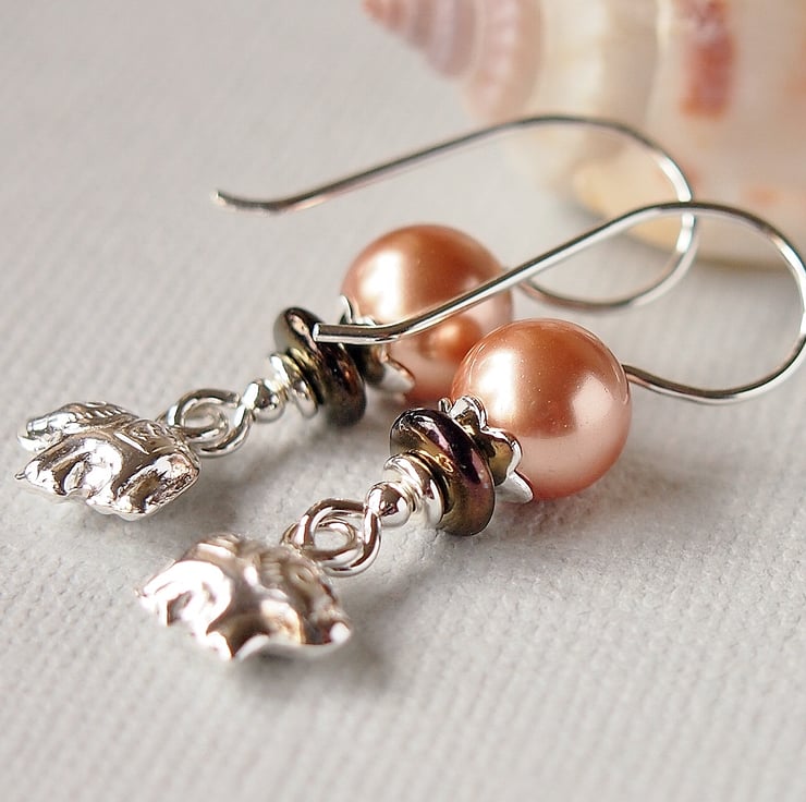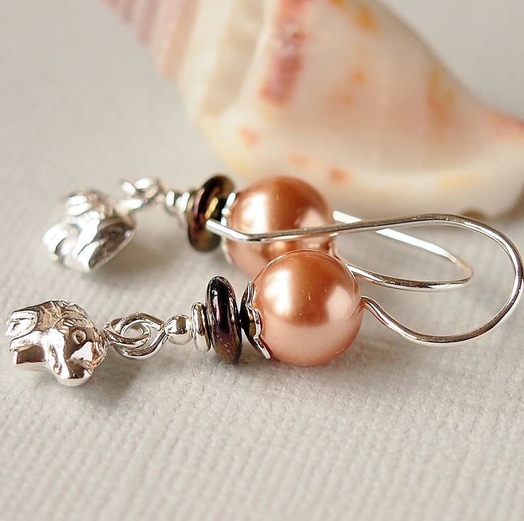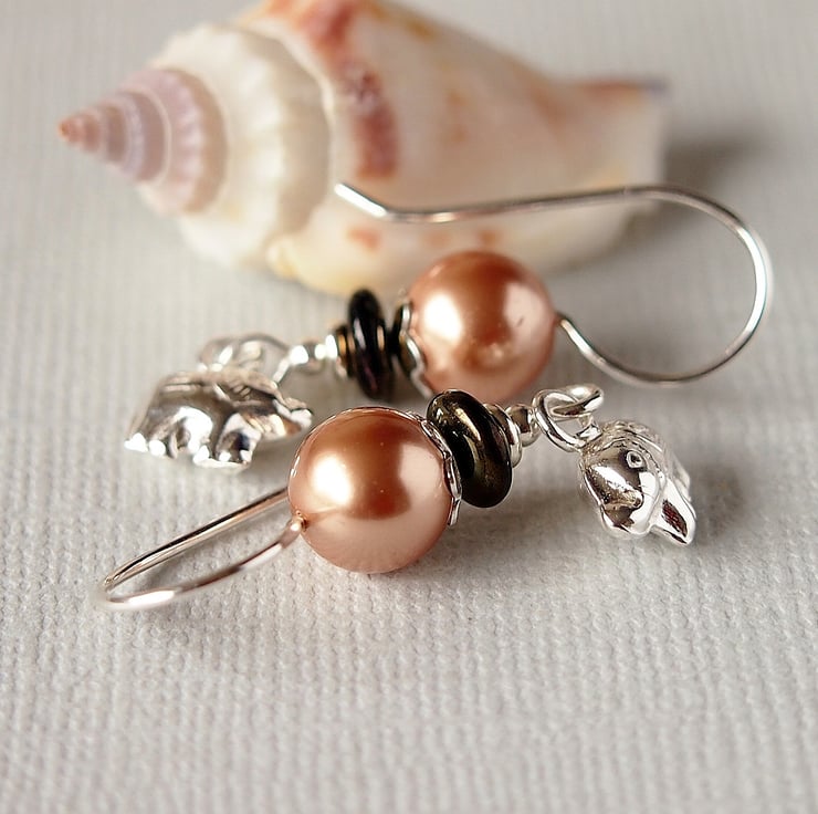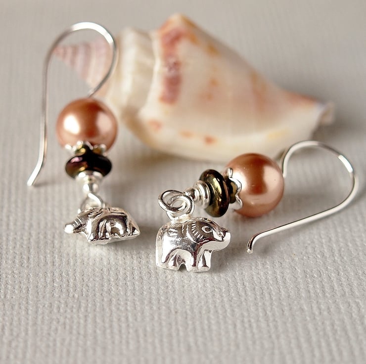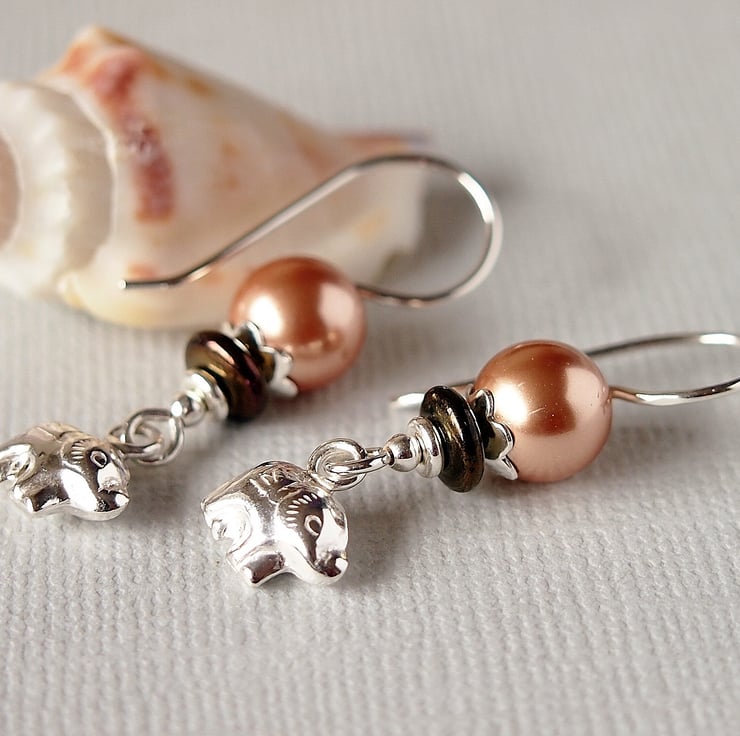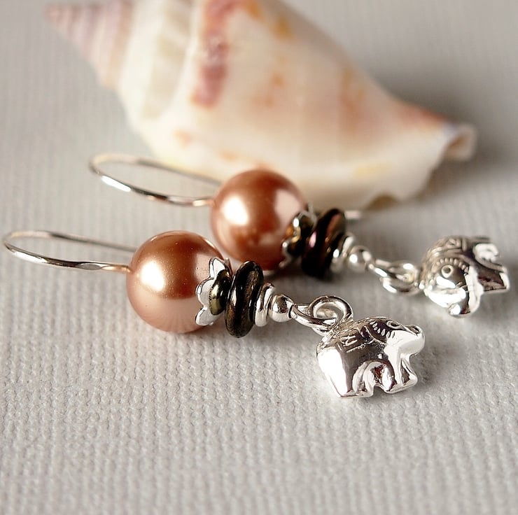 The main part of these pretty earrings has been forged from one piece of 20g silver wire on which I have threaded a Swarovski crystal glass pearl nestled in a sterling silver daisy beadcap with a complimenting Czech glass bronze disc and sterling silver beads. A cute elephant charm swings gently at the bottom