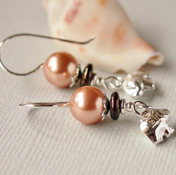 Handmade earrings featuring Rose Gold Swarovski pearls with Elephant charms.