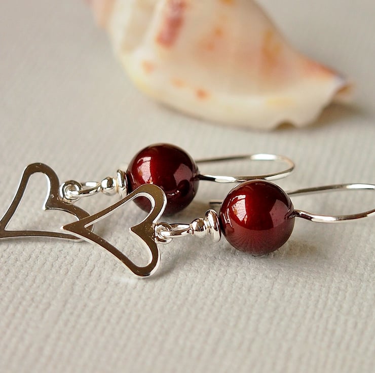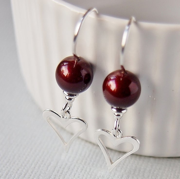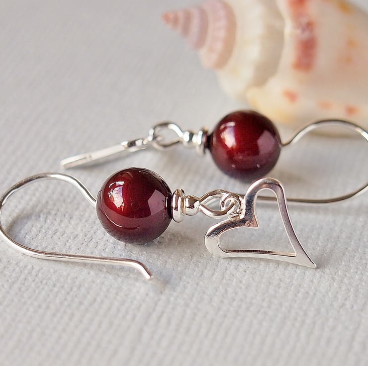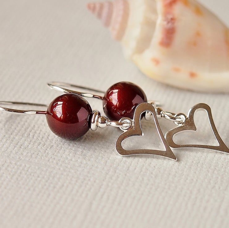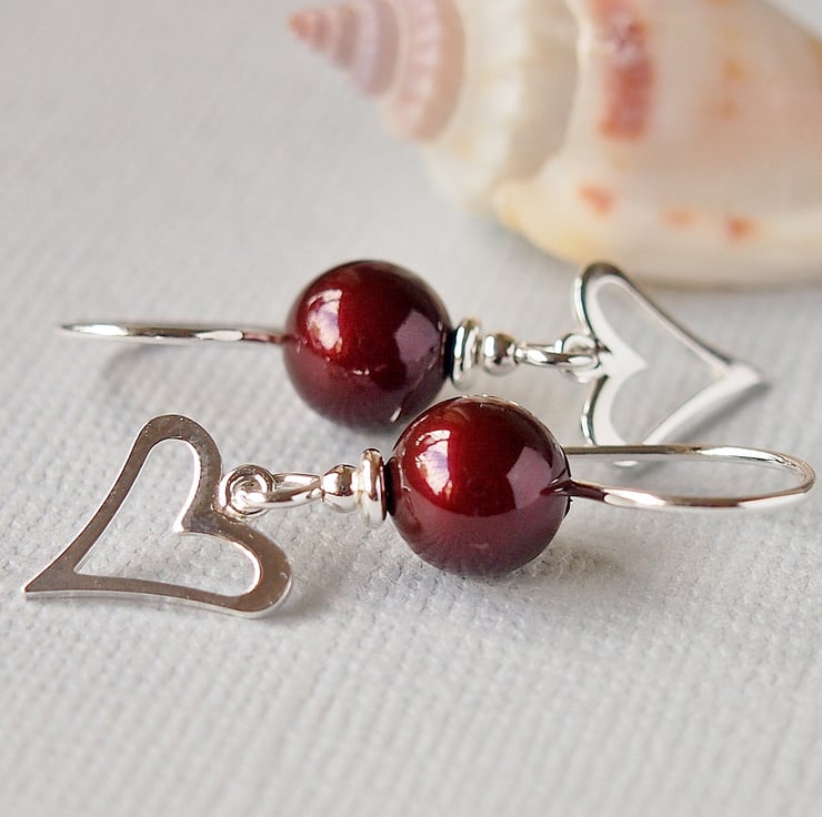 Dark Red Pearl Earrings - Heart Charm Earrings - Maroon - Sterling Silver