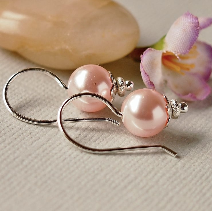 Handmade earrings featuring Rosaline Swarovski glass pearls.