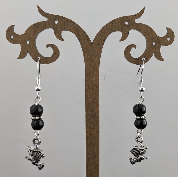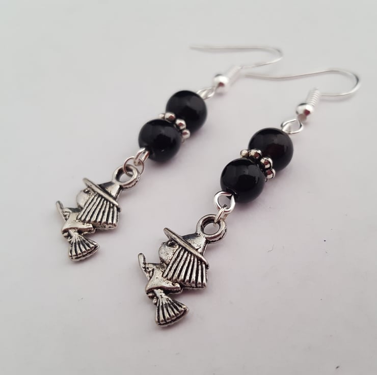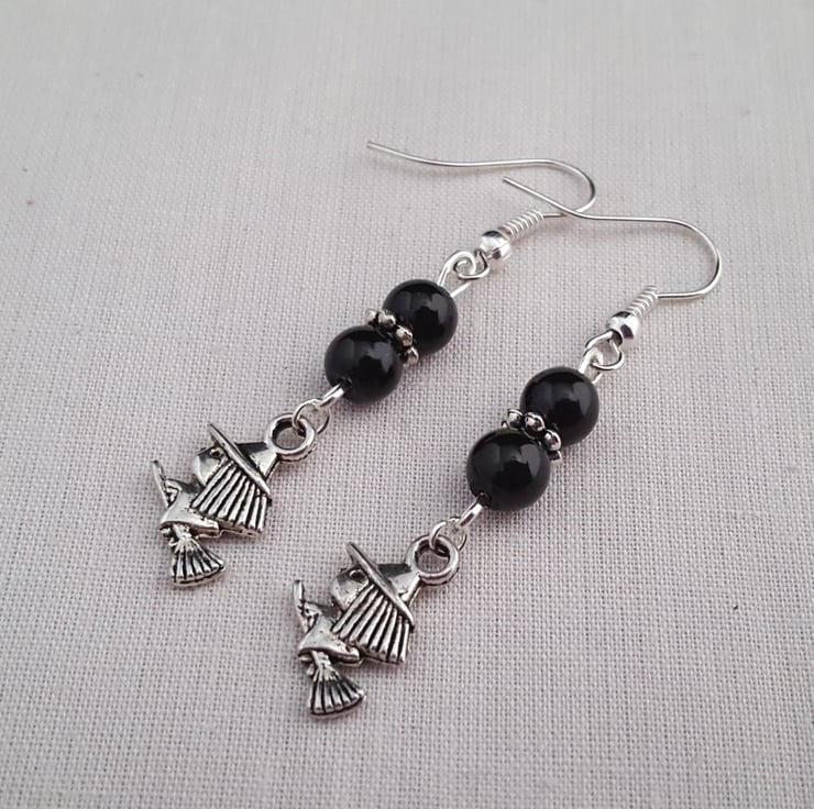 6mm black glass pearls and double sided Tibetan silver witches on broomsticks. 35mm long excluding the hypo allergenic silver plated hooks. In an organza gift bag.