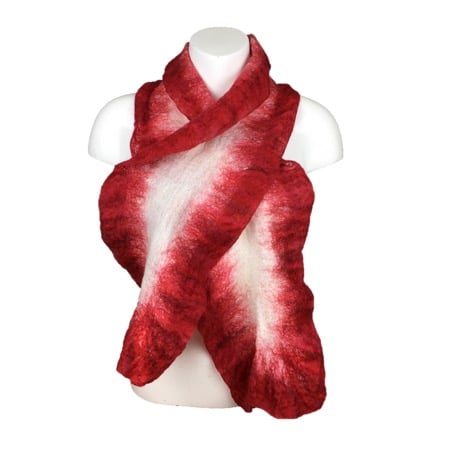A wonderful scarf in natural white (undyed, unbleached) merino wool nuno felted onto a silk chiffon base with a slightly ruffled border in shades of red. Included in Seconds Sunday as a clearance/end of line item.