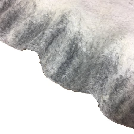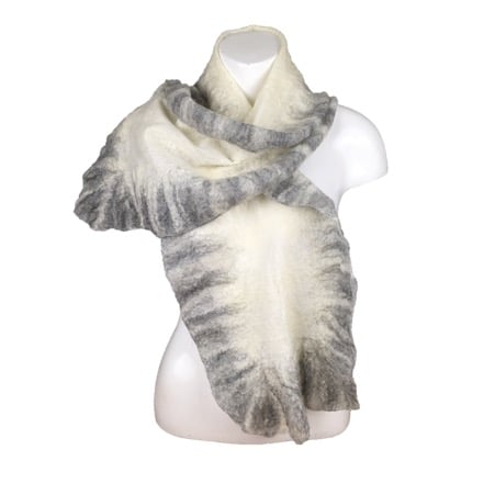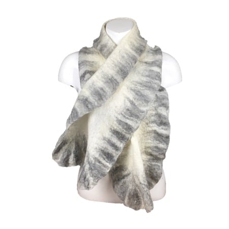 Very fine layers of white merino wool have been laid over a silk chiffon base to form the body of this scarf with a blend of natural grey merino wool added to form the border. The scarf has been nuno felted which causes the woollen fibres to migrate through the silk and bind with it. The layout and manipulation of the border during the felting process results in a ruffled effect.