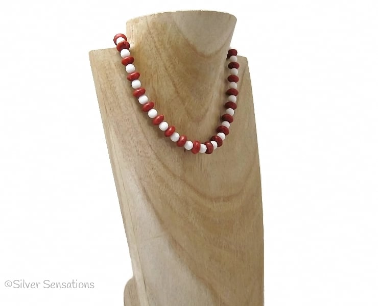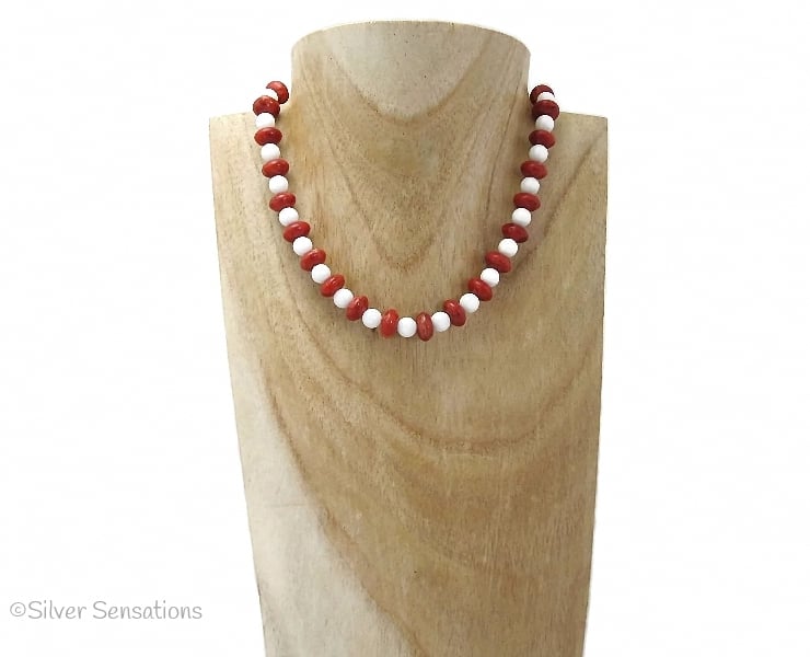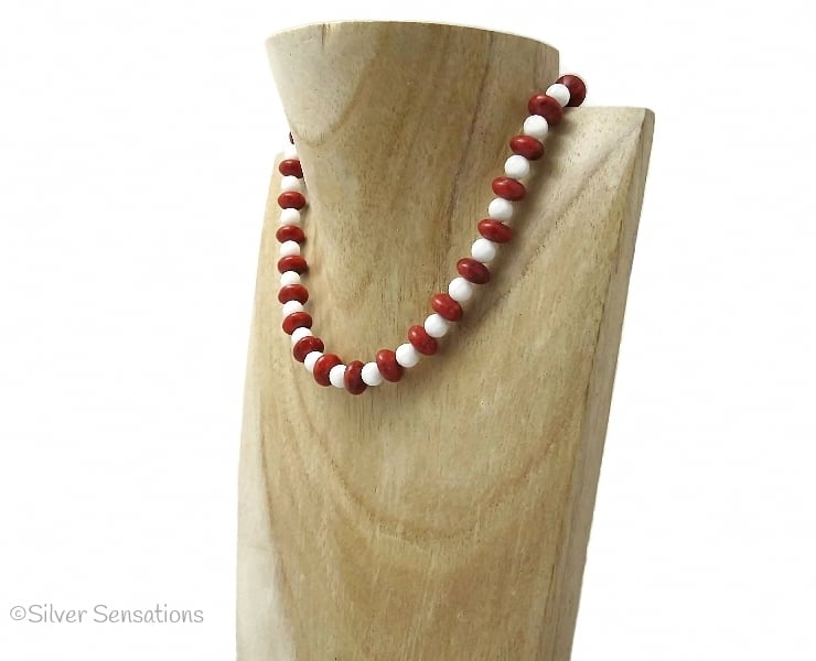 For this handmade ladies striking necklace I chose 6mm round White Agate beads which have a red Sponge Coral 10mm x 5mm rondelle shaped bead between each one.