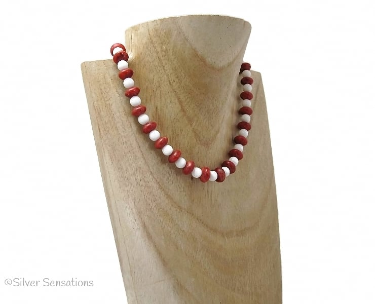 For this handmade ladies striking necklace I chose 6mm round White Agate beads which have a red Sponge Coral 10mm x 5mm rondelle shaped bead between each one.