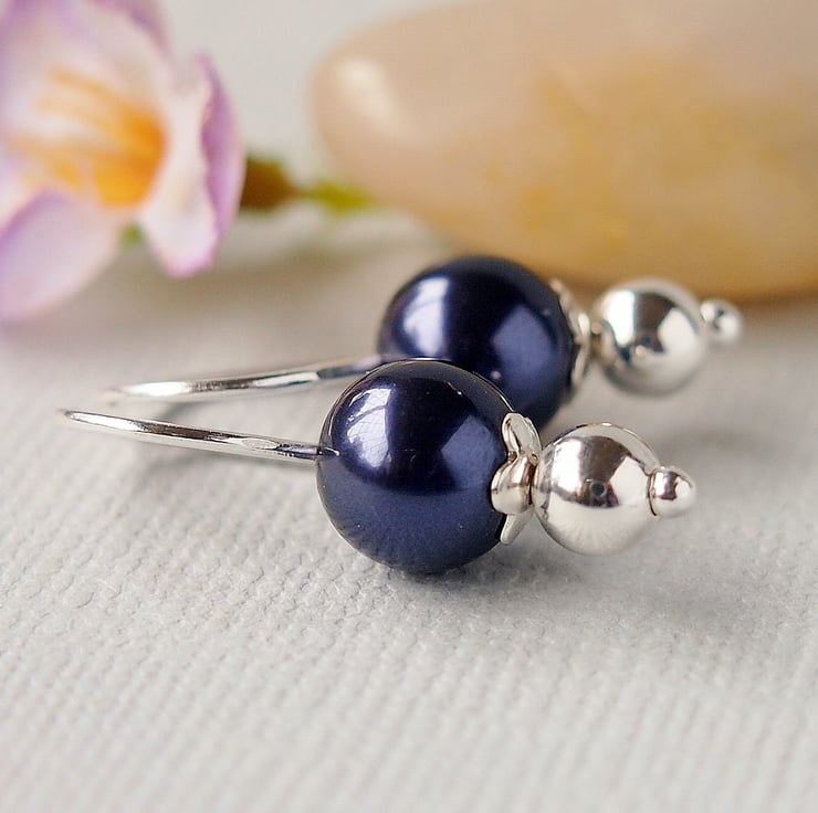 Pretty earrings forged from 20g silver wire with Swarovski crystal glass pearls nestled in a sterling silver daisy beadcap and a sterling silver beads.