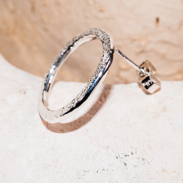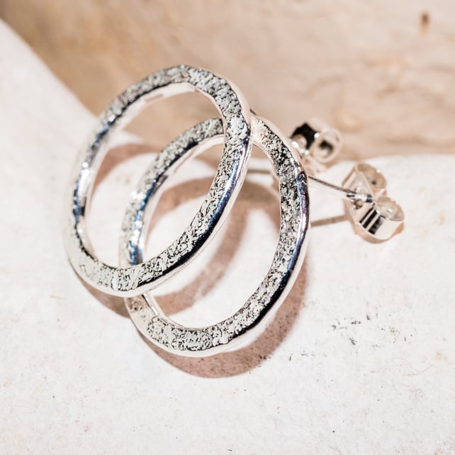 These shimmering circles made by hammering ecosilver on rough stone - so the soft silver takes up the patination of the stone. These are made with one of my favourite hammers. They are really lovely to make - and I always make them outdoors. When finished and polished they have a lustrous quality that gives them a real presence when worn. They have hand made ear pins. I can make the circles to any size you might want. These are roughly the size of a five pence piece.
