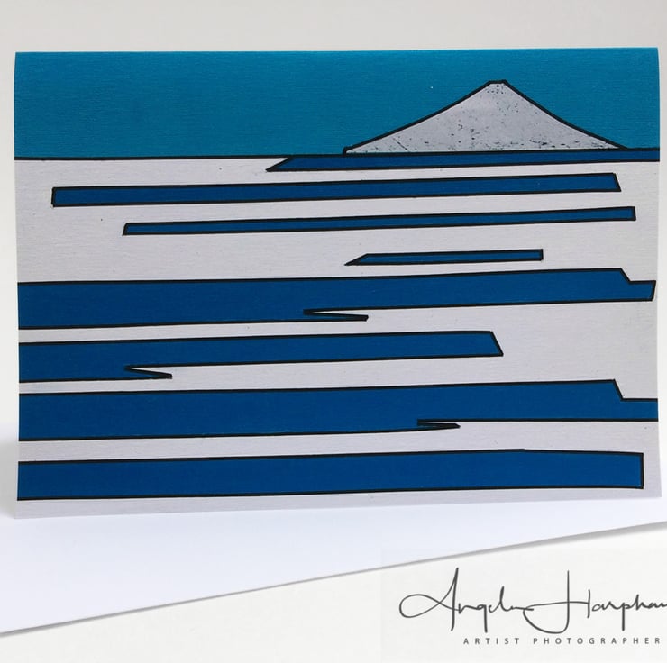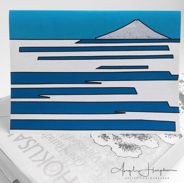 A Fine Art Blank Card from an acrylic and collaged original painting. It is in the cloisonné, comic book style and am homage to the Japanese printmaker Hokusai. Mount Fuj was created using part of one of my own photographs.