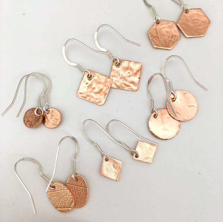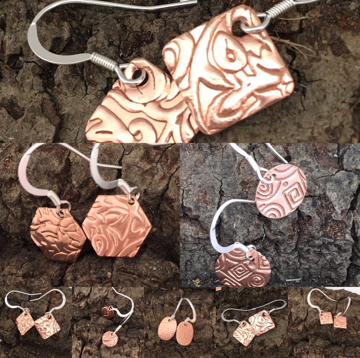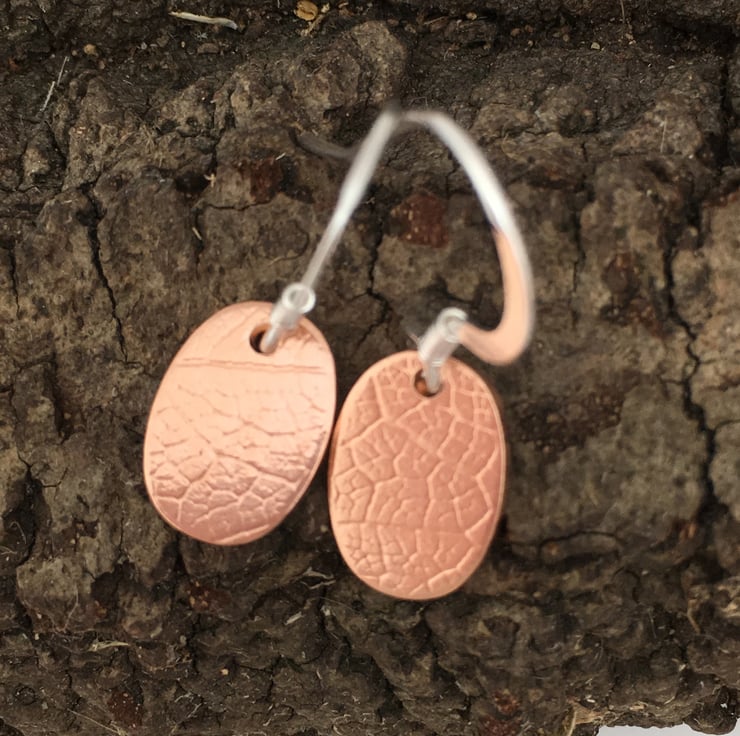 Patterned Copper drop earrings made from silver & recycled copper. Simple, earrings suitable for everyday, light & comfortable to wear with the warm colour of Copper. The Silver post or hook is gentle on even the most sensitive skin.