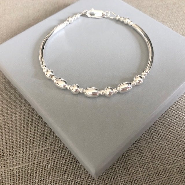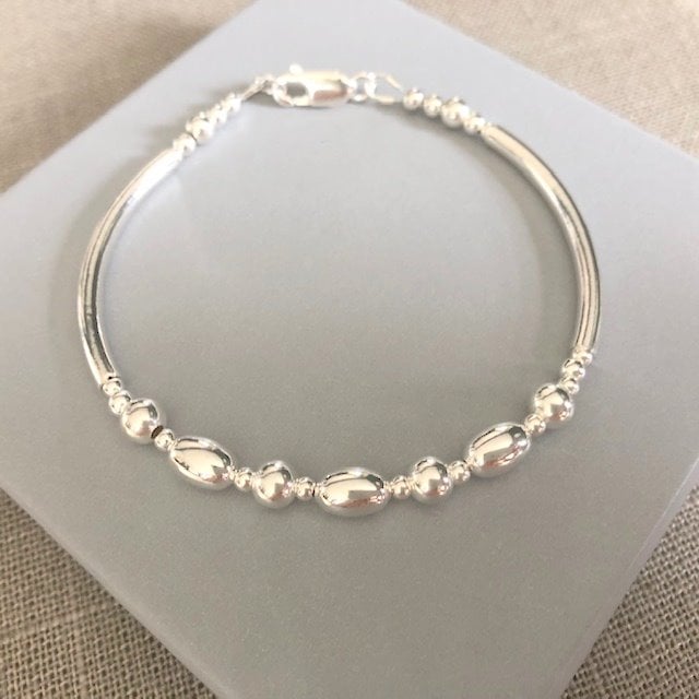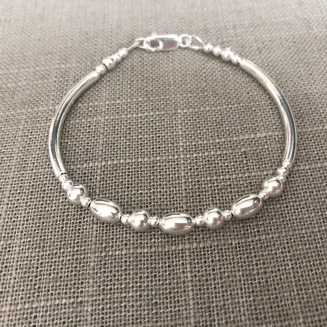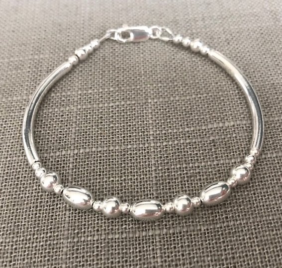 925 Sterling Silver Bangle Bracelet - I made the noodle bracelet with Sterling Silver oval, round and tube beads, beaded onto premium professional quality beading wire. I finished the bracelet with a Sterling Silver lobster claw clasp with wire guards at the clasp area, giving additional protection to the beading wire.