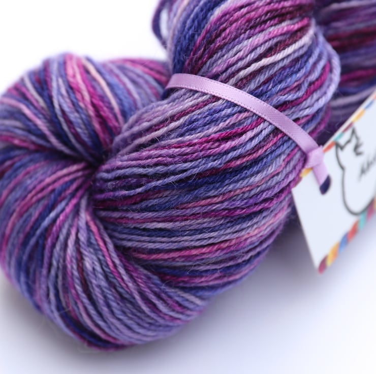 Shades of violet, lilac, pink and purple. This Bluefaced Leicester superwash yarn is soft with a very slight lustre. Photos taken and edited in bright natural light.