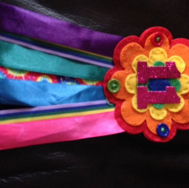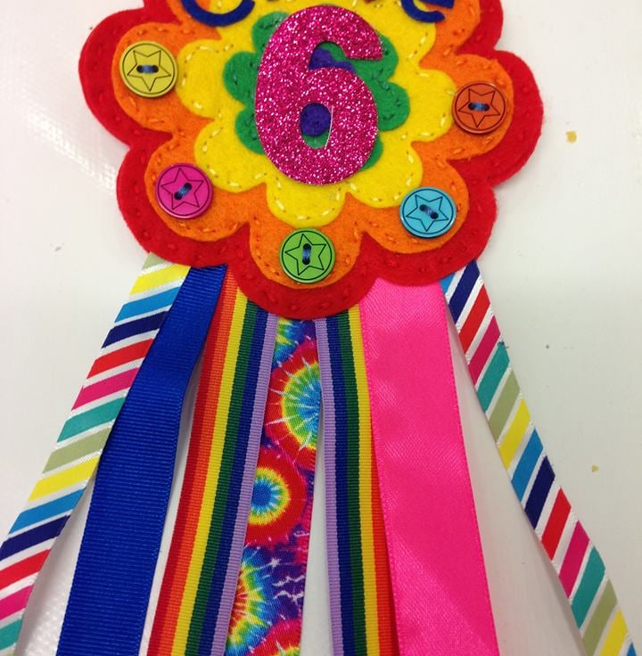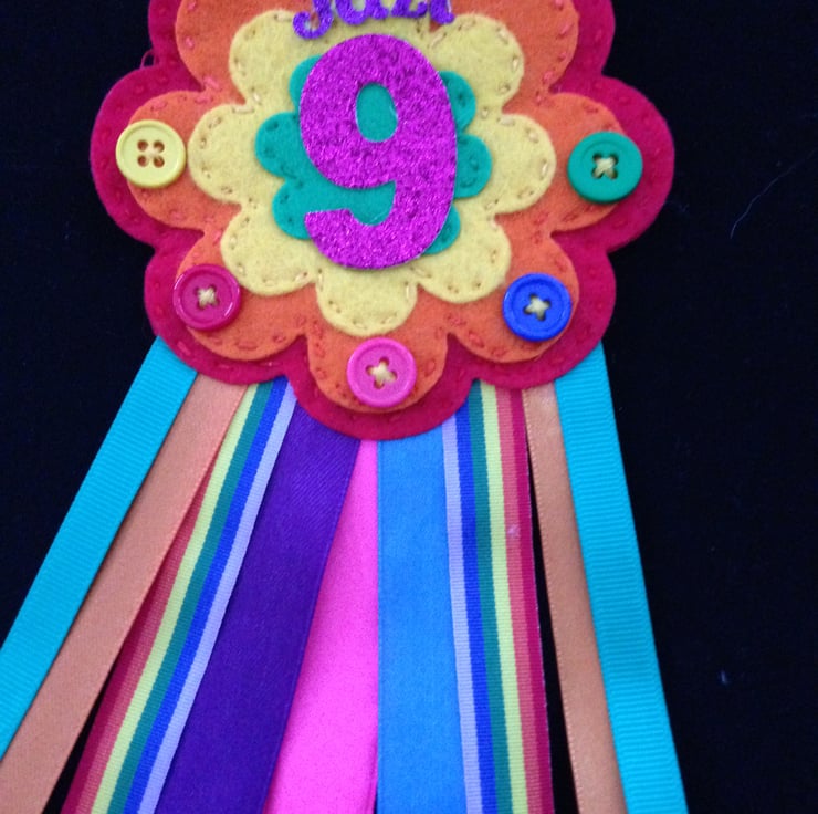 Birthday badges made in felt/fabric, many designs in any colours, this is a rainbow shades flower design Personalised with any age and name