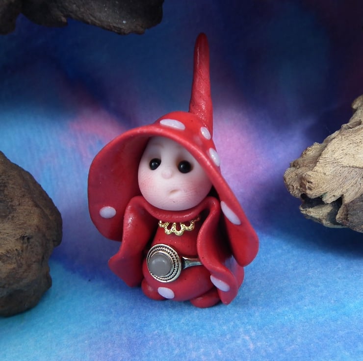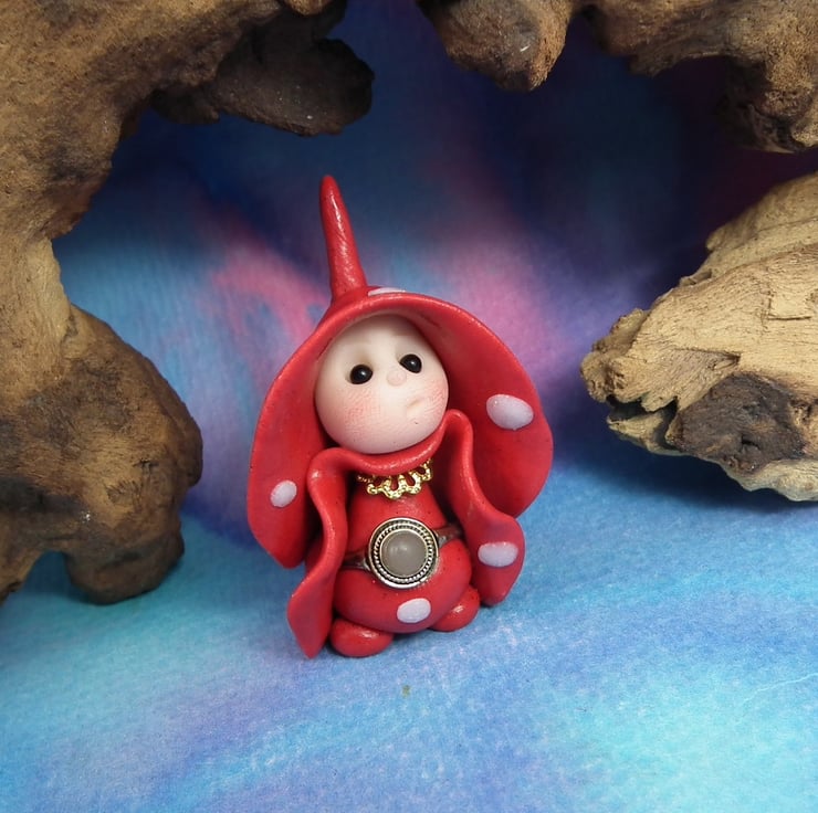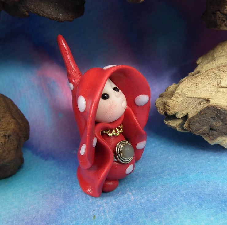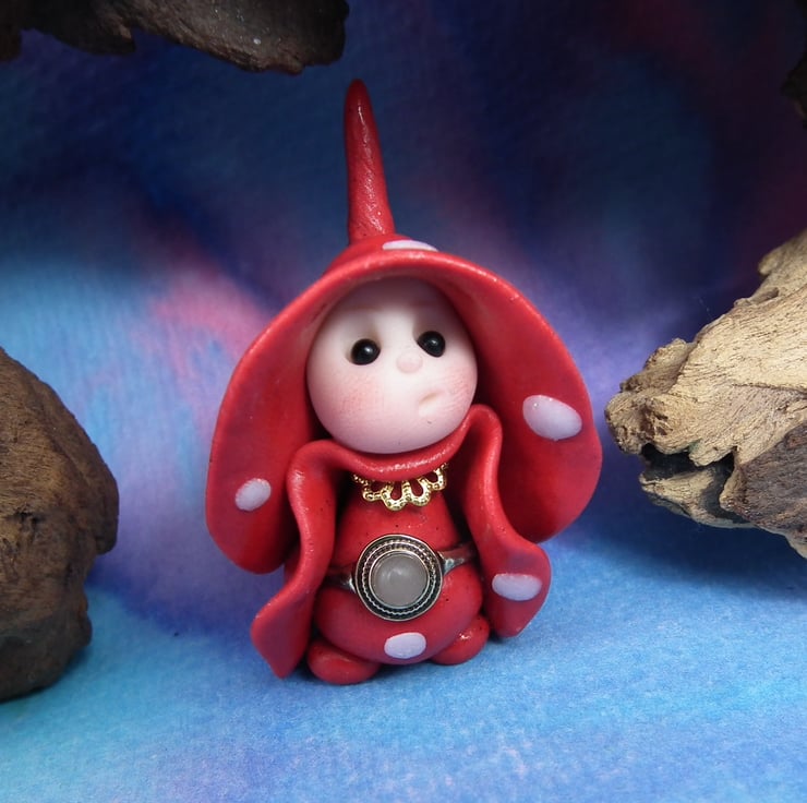 This is a 'one of a kind' creation having been entirely handmade without the use of moulds here at my studio on the Sussex Coast. Modelled with Prosculpt polymers, painted with heat set paints before sealing with lacquer, Folly has sparkling black onyx eyes. Folly the Toadstool Gnome is just over one and a half inches tall.