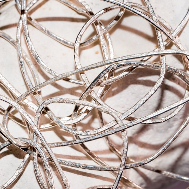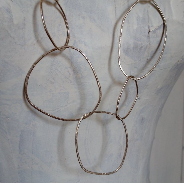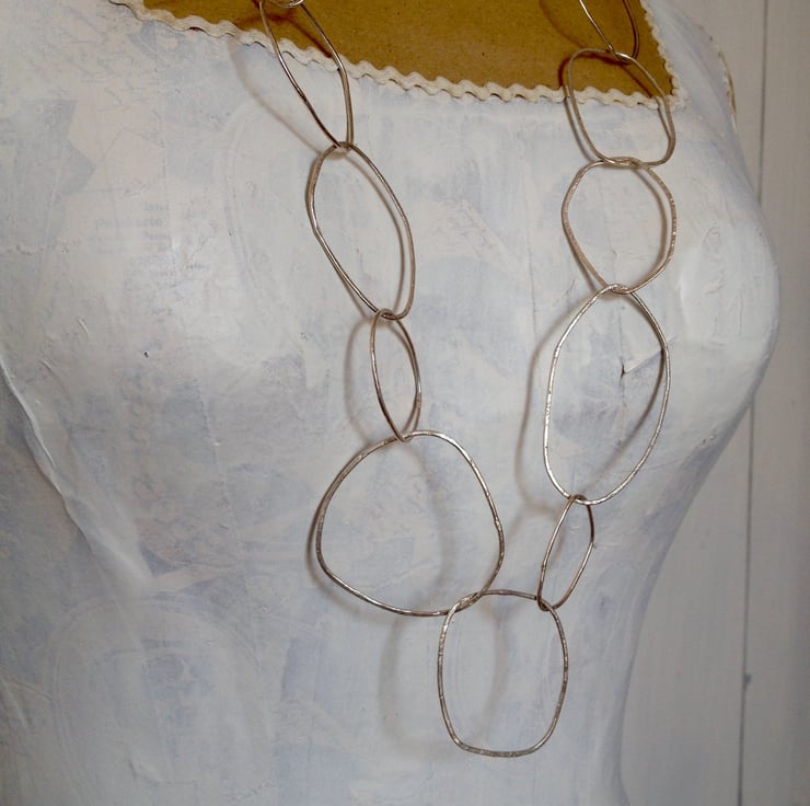 This necklace is made of pebble shaped links. It measures 90cm, so hangs mid torso. But I can make it to the length of your choice. All of the 'pebble' links are handmade and made by hammering ecosilver on rough stone - so the soft ecosilver takes up the patination of the stone. These are made with one of my favourite hammers. They are really lovely to make - and I always make them outdoors against the natural stone. For each pebble link I have taken my inspiration from a stone washed up on the beach. Getting the right combination of links together takes time. But when it all comes together you just know - as it hangs and sits beautifully. This piece is mine, but I can make you one very like it. I wear this most days as you can literally throw it on and it looks great which ever way the 'pebbles' hang!