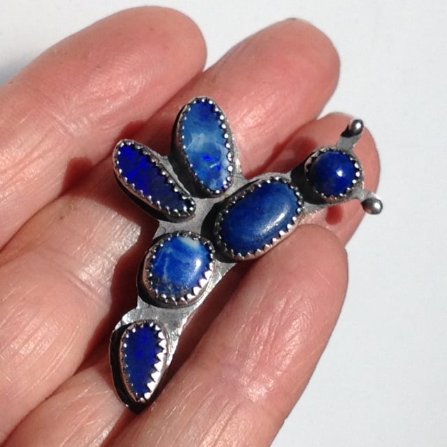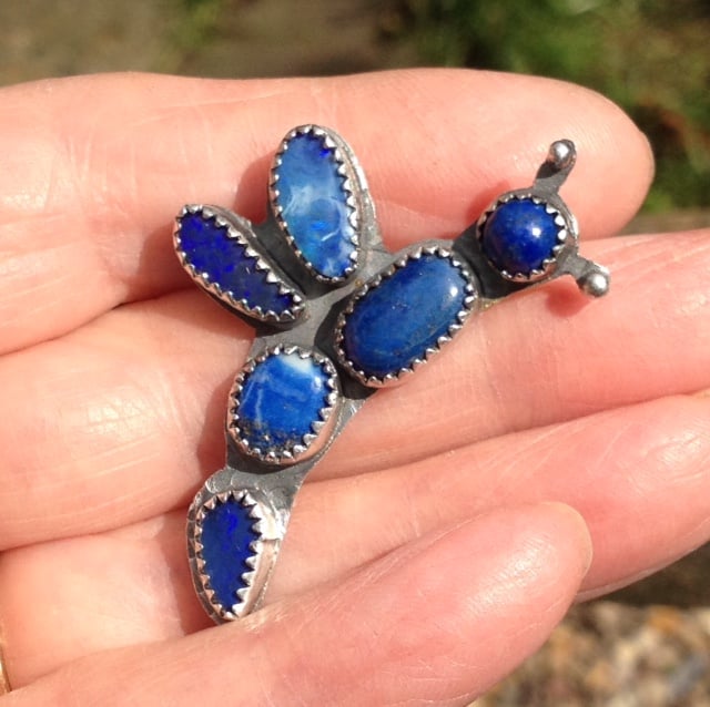 Sterling silver brooch with 3 Lapis Lazuli stones and 3 blue Australian Opal doublets. This is a one of a kind brooch. It has a steel pin and silver security latch and is marked 925 and W (thats me) I added 17 for the year as it was too light to warrant assaying and hallmarking. A patina has been added to the silver to highlight the lovely colour of the stones.