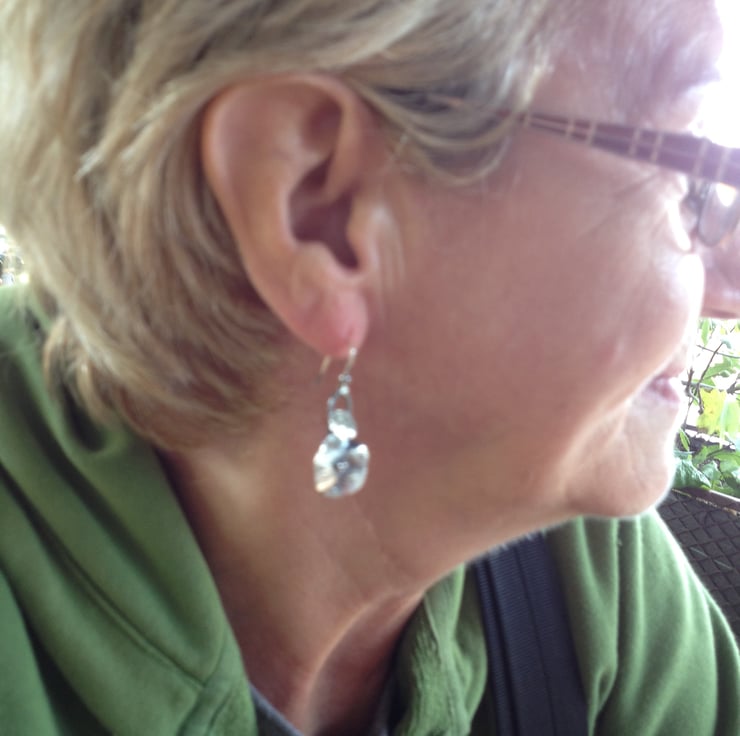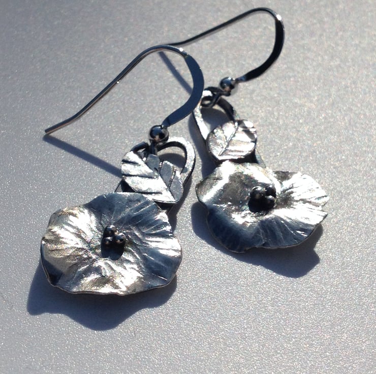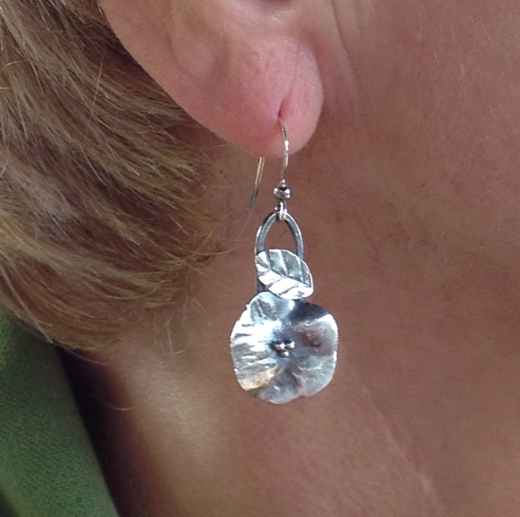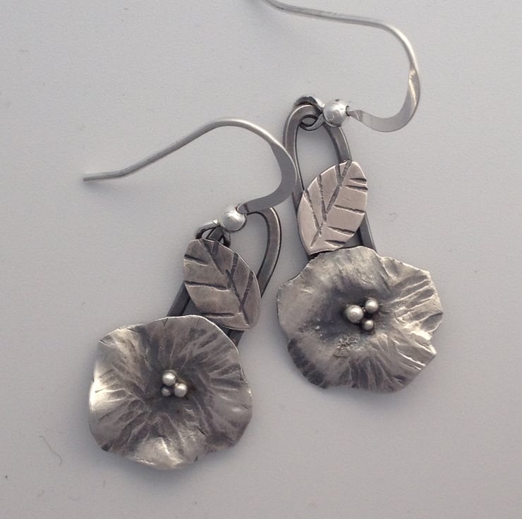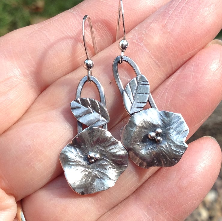 Sterling silver hammered flowers with a pretty little leaf above make these hand forged dangly earrings really eye catching. Measuring 18mm at the widest point and 40mm from the top of the ear wire they are very comfortable to wear. I have added a patina to the silver then polished it back from the edges and high points to add definition. The earrings will come nicely packaged and ready to be given as a gift with soft earnuts for security