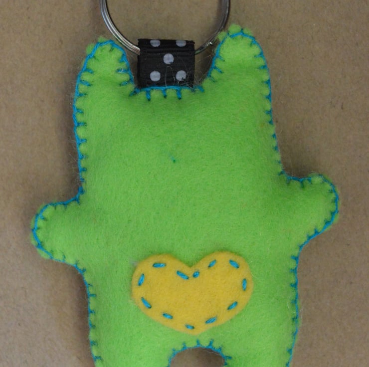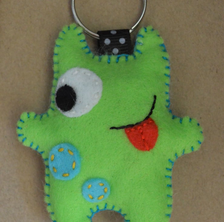 Little green monster will happily look after your keys or hang onto anything. He is a hand stitched felt stuffie created from my own design and will hopefully make anyone smile or laugh!