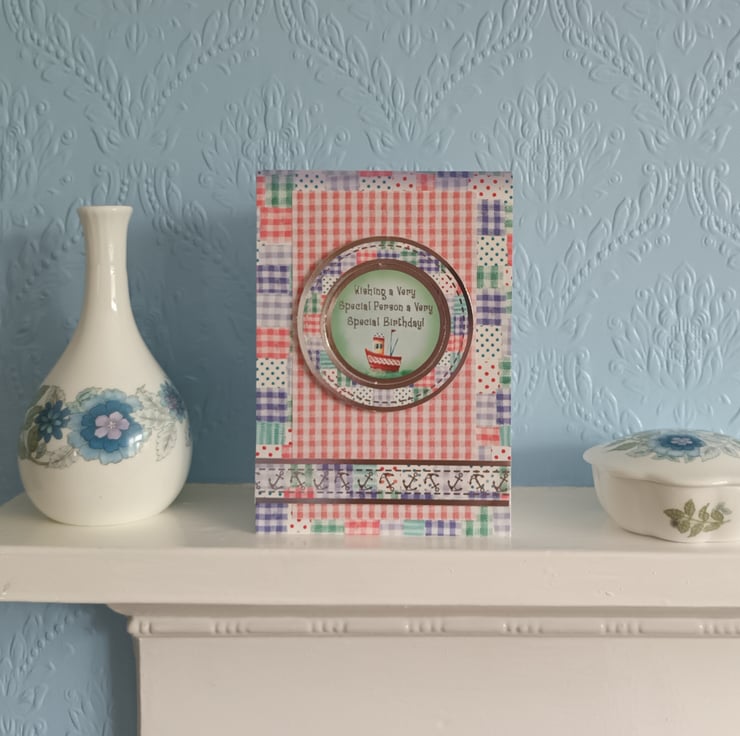 I have layered a card with different checked papers. I’ve then added a little boat and the sentiment “Wishing a Very Special Person a Very Special Birthday”.