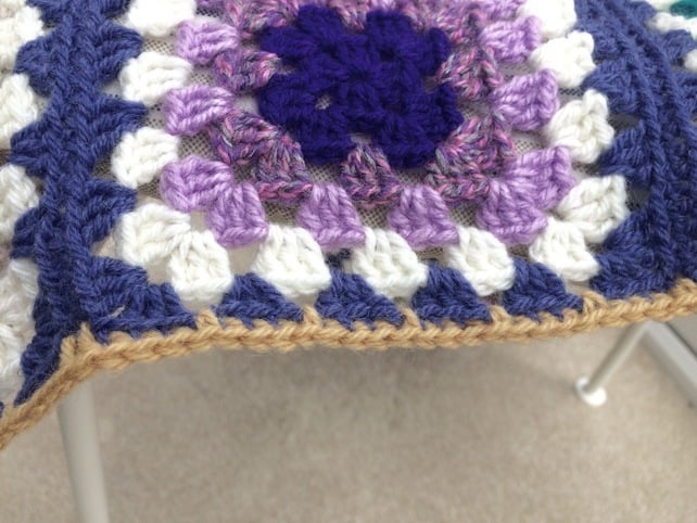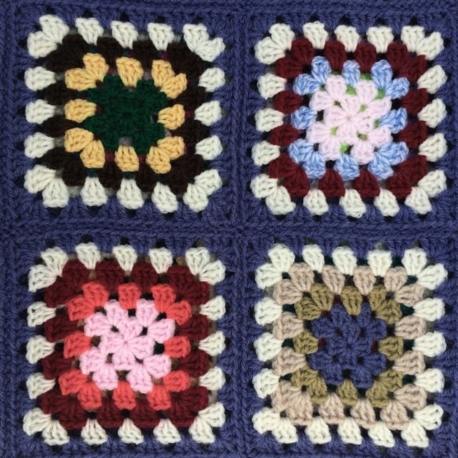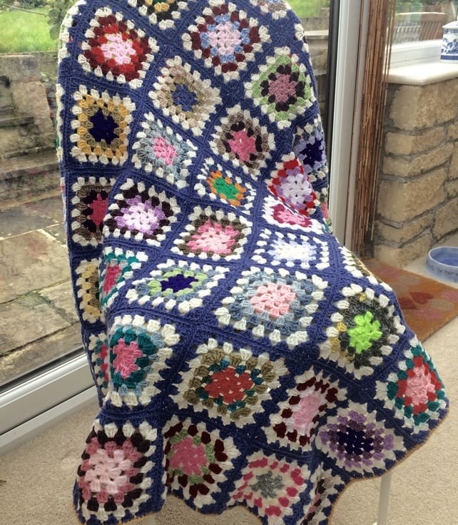 A lovely toasty lightweight lap blanket made from colourful granny squares crochet with wool/mix and Sirdar Country Style denim blue and winter white, edged with a my pretty signiture 70's stitch.
