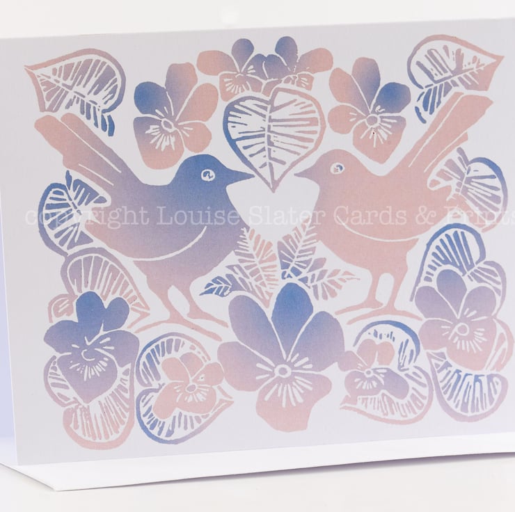 Pack of 4 of our popular greeting card design - Violets & Lovebirds