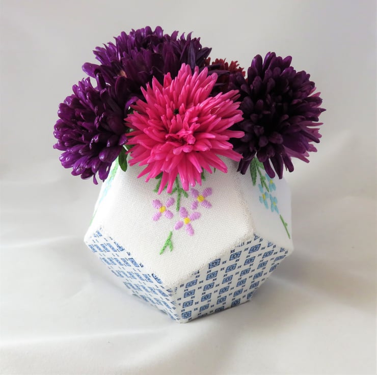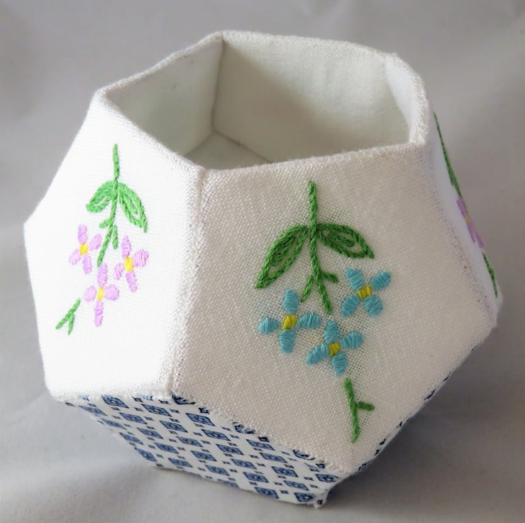 A pretty vintage, blue and white, pentagonal base, surrounded by five pentagons - each of blue and white vintage fabric - lined with white, topped with five more pentagons of vintage embroidery with white fabric on the reverse - form this pretty bowl. Each fabric patch is folded over a template of interfacing which remains in place in the completed vessel to add structure.