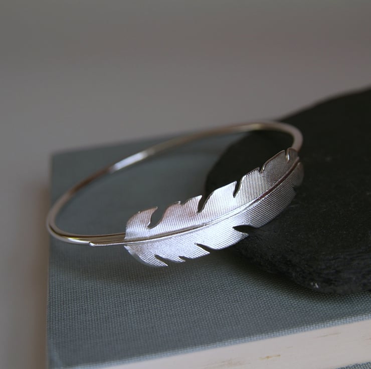 This solid silver round bangle has a single plume swooping around it. The feather is fixed (not spinning) and is intricately patterned like a real feather with uneven fronds cut out on each side.