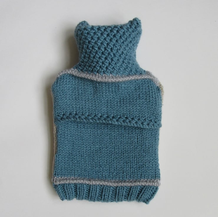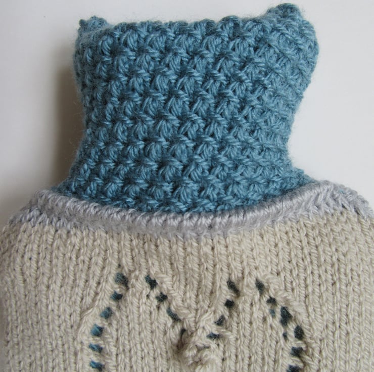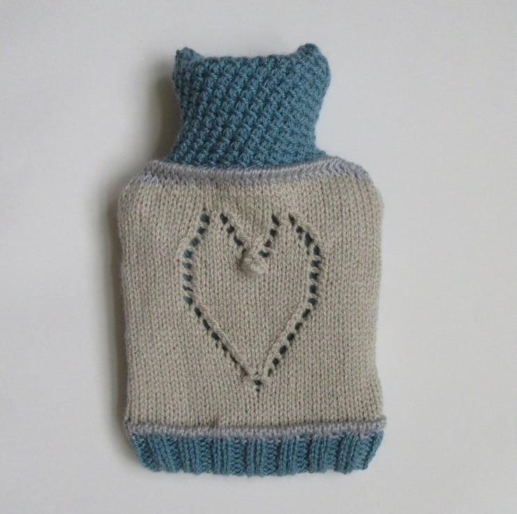 A hand knitted colour block hot water bottle cover with a panel of lace work on the front. The back envelope style opening is edged in a teal coloured lacy stitch, which is the carried on up over the neck of the cover. At the front there is a pewter silver coloured tuck at the top and bottom of the front panel. The front panel is knitted in a parchment coloured yarn and has a naive heart in open lace work knitted into it and a bobble. The bottom hem is knitted in a teal coloured rib ensuring a snug fit around the bottle. Again a silver tuck stripe and a teal coloured back.