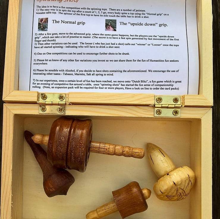 A fun game aimed at Adults with a table aiming to have a social evening enjoying Drinking Shots. see you tube video https://youtu.be/C8xftVMr9CY The set consists of a wooden box, four shot glasses and four spinning tops. We play for an hour or so, using a wooden table top (if one is not available you could use the box lid), we then usually play "Dutch Blitz" a card game you can buy from the internet and usually have a fun evening with four or six of us. We hope to share this fun with the Spinning shots pack. (Note Dutch Blitz cards are NOT included) Note. We advise sensible and responsible use of alcoholic drinks, but you could still enjoy this game as an Alcohol free fun activity. Note in the photo 3 boxes are shown, this is offering 1 box with 4 spinning tops