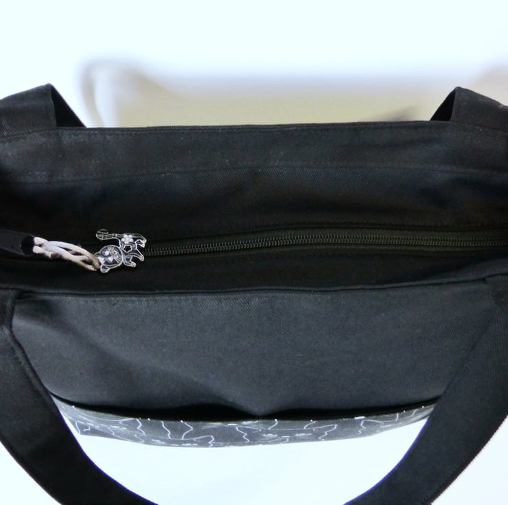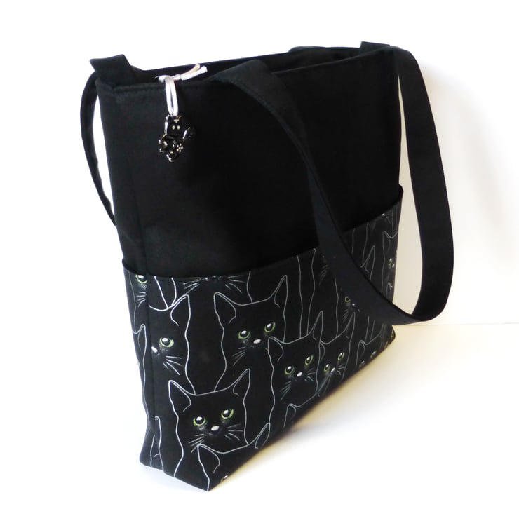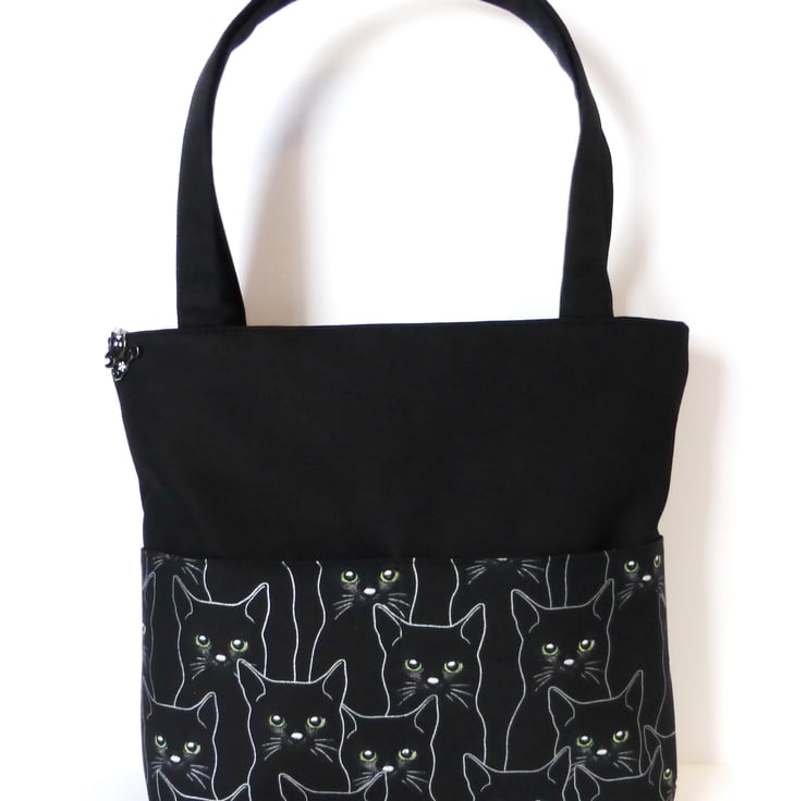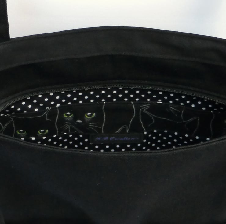 A lovely handbag made from a black cotton drill fabric and a cotton fabric with a black cat design.. The cats on the fabric are outlined in metallic silver and have green eyes.