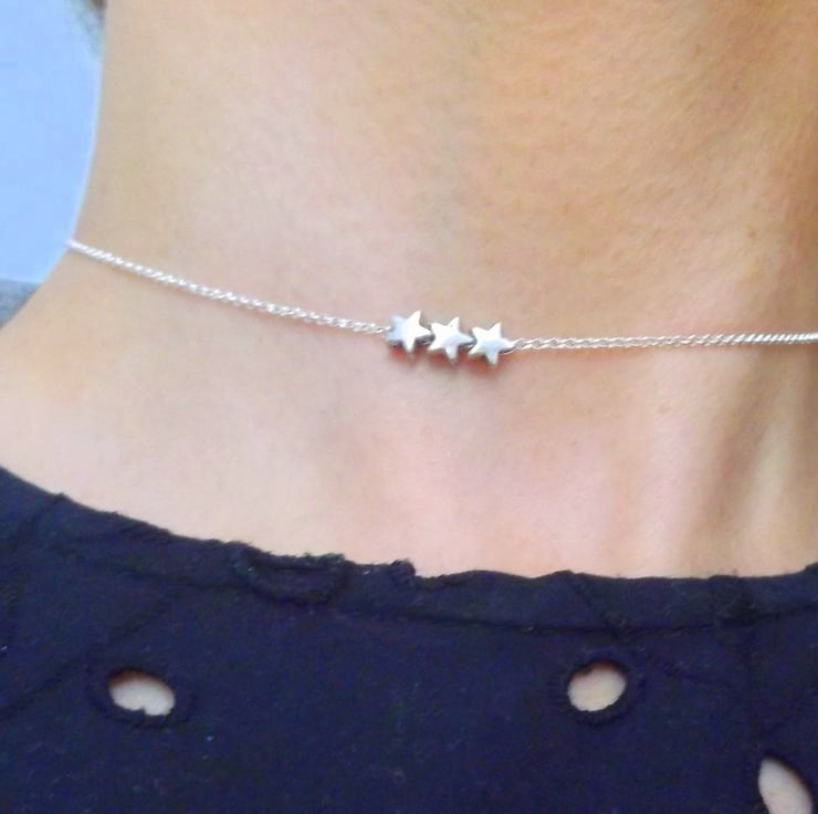 A sterling silver chain with 3 mini 5mm stars. The stars can move along the chain. Please advice the length you would like, 15 inches, 15,5 inches or 16 inches. Free gift box tied with ribbon.