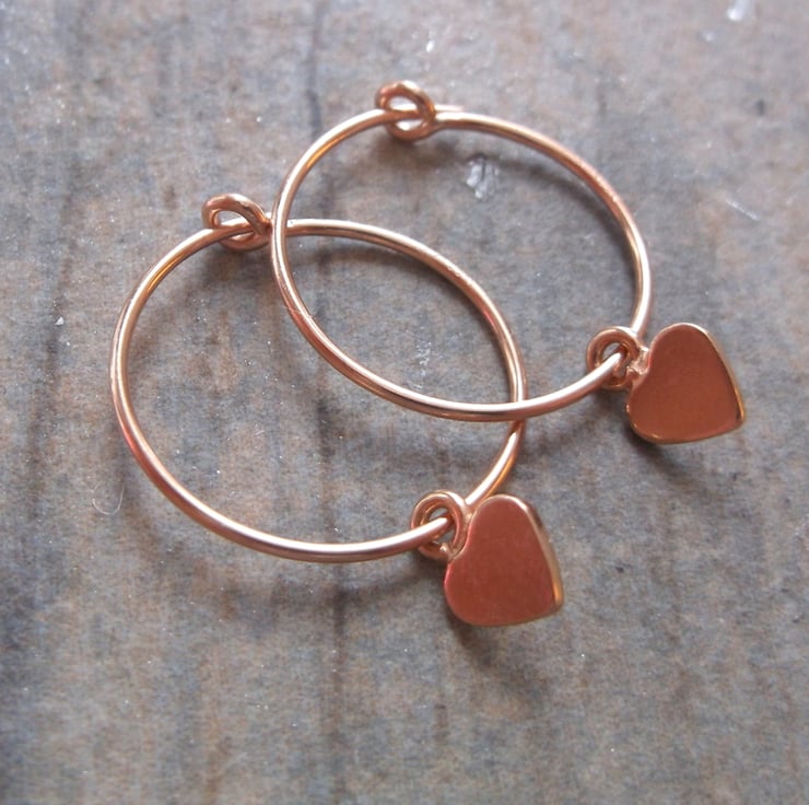 15mm rose gold filled hoops with 5mm rose gold vermeil heart drops. The hearts can slide off so the wearer can wear the hoops alone. Free gift box tied with ribbon.