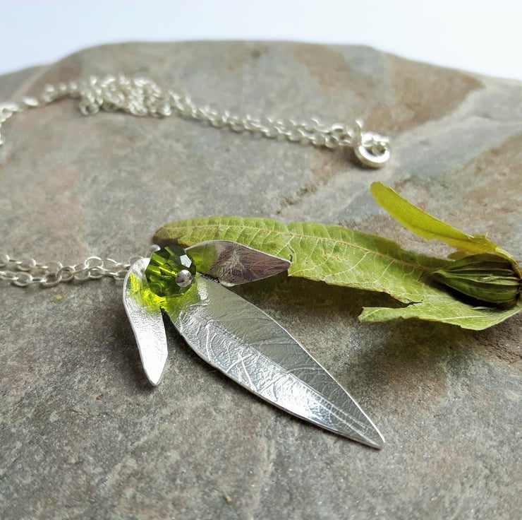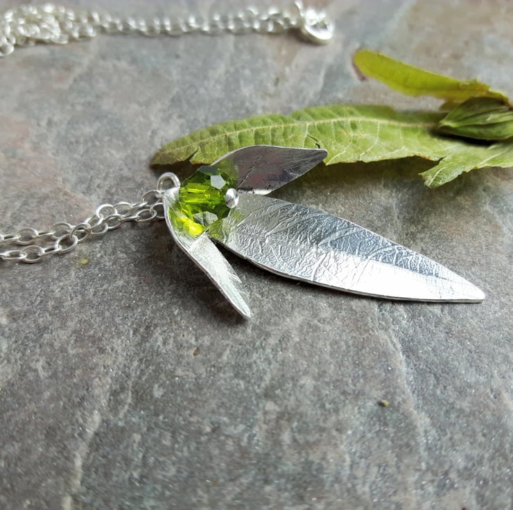 I created this delicate silver pendant to represent a samara, the papery leaf-like fruit of the hornbeam tree, which is often found on woodland walks in September. They grow in clusters and the three-lobed leafy structures act like wings, helping to disperse the seeds by spinning along in the wind. I have used a real samara to imprint the shape and texture onto sterling silver sheet, then used doming tools to give it a natural organic shape. The green Swarovski crystal is there to represent the central seed. It is attached by means of a sterling silver head pin which passes through a hole and forms the bail. The pendant hangs from a sterling silver trace chain, 18inches/45cm in length, fastened by a bolt and ring clasp stamped .925 for sterling. The pendant itself measures 1.5x0.8inches/3.5x2cm. It will be packaged in a smart gift box and sent to you by Royal Mail first class post.