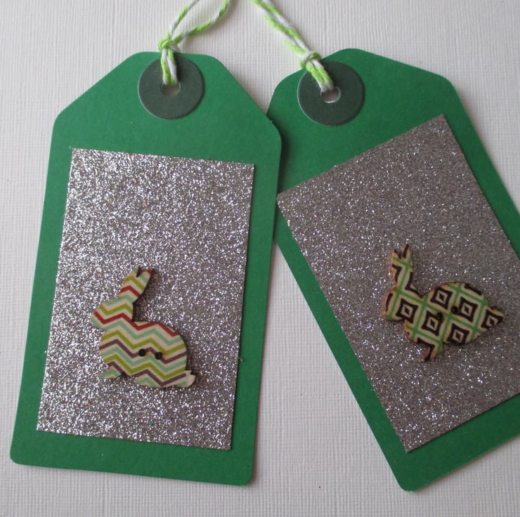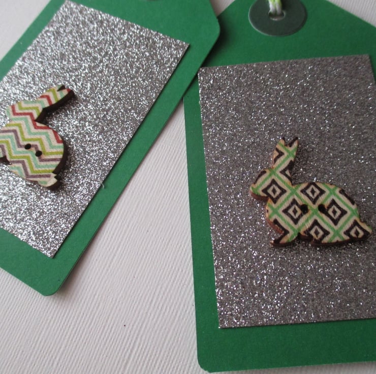 A pair of Christmas gift tags, embellished with a wooden bunny rabbit button.