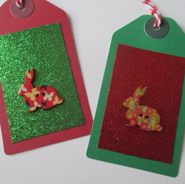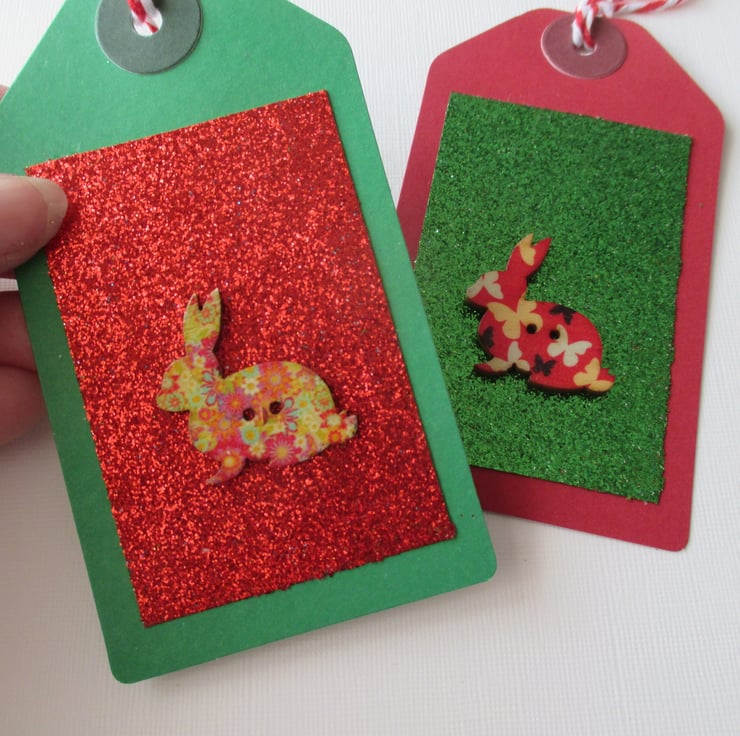A pair of Christmas gift tags, embellished with a wooden bunny rabbit button.