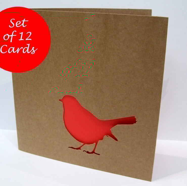 This beautiful and simple design features a paper cut silhouette of a robin on recycled brown Kraft card with a red paper insert.