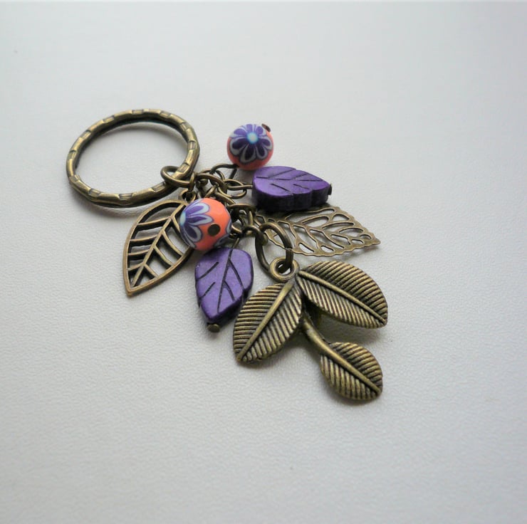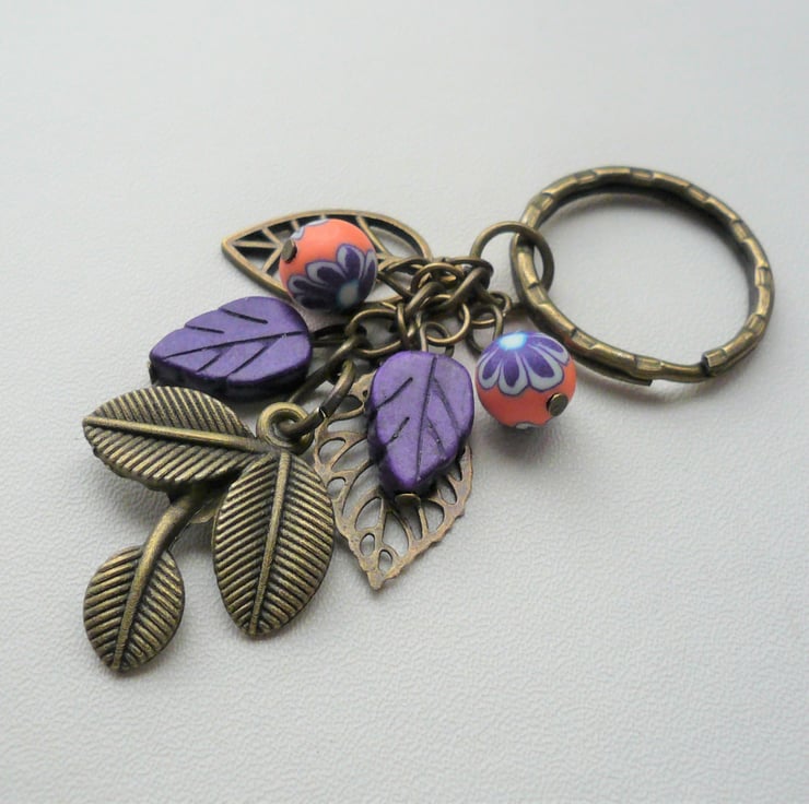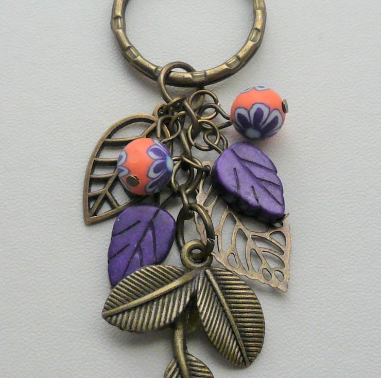 Pretty keyring or bag charm consisting of three different antique bronze leaf charms teamed with purple and orange polymer clay and purple Howlite leaf beads. All attached to an antique bronze 25mm ring and chain. Total length incl ring is approx 8cm.