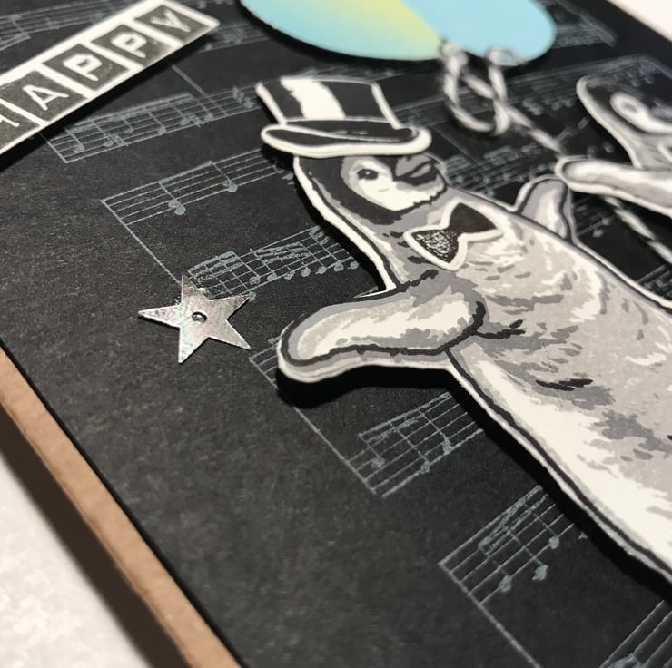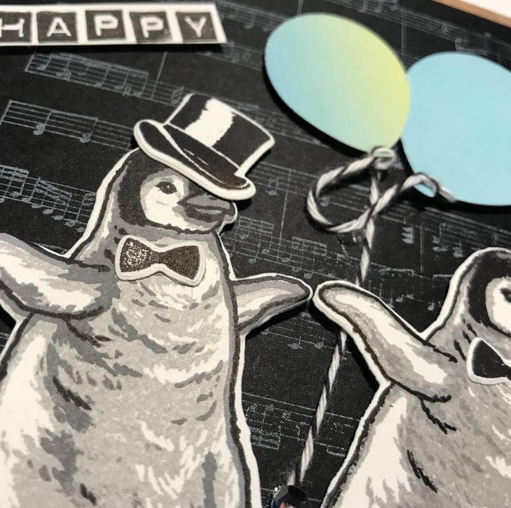 Each penguin is stamped in three colours (smokey slate, basic gray and archival black) and then die-cut. One penguin has a black top hat and bow tie, the other just a bow tie. They are holding onto two punched balloons from ombre cardstock, with bakers twine affixed to the balloons.