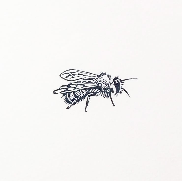 An original hand drawn and carved lino print depicting a Red Mason Bee, printed in indigo ink on Fabriano Rosaspina archival paper.